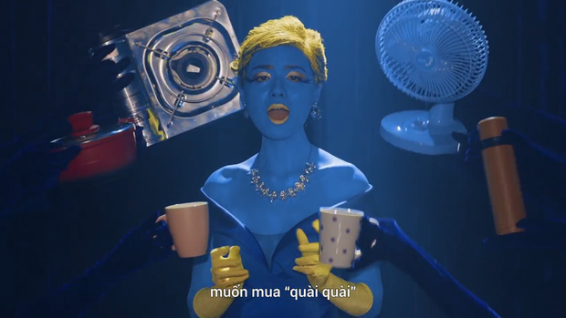 Chưa kịp giật mình vì mỹ nhân màu xanh kỳ quặc này thì khán giả đã được phen cười bò khi bài hát chủ đề vang lên. "Phận là phụ nữ, mua đồ là đam mê. Quạt, nồi, bếp gas, bình, tách, ly... muốn mua 'quài quài'..." - Trên nền beat của ca khúc "Duyên phận", mỹ nhân màu xanh đã hát lên tâm tình của biết bao chị em khớp một cách xuất sắc!