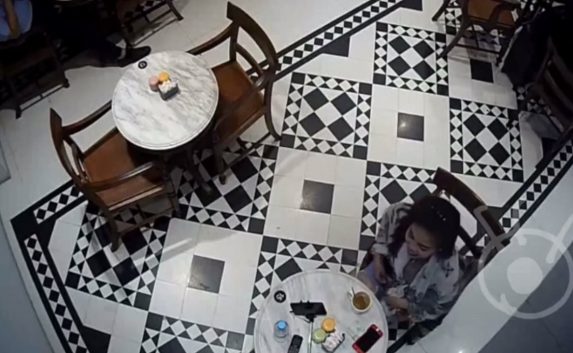 Người đàn ông này đội mũ Adidas che khuất mặt, một tay xách túi, một tay cầm điện thoại. Ông ta chọn chiếc ghế ở tầm khuất của camera theo dõi. Một lúc sau, Siti Aisyah bước vào, ngồi đối diện với người đàn ông, và bắt đầu trò chuyện.