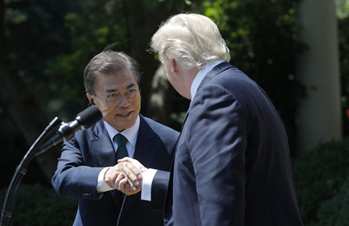 Tổng thống Hàn Quốc Moon Jae-in bắt tay Tổng thống Mỹ trước khi tuyên bố thông cáo chung tại Nhà Trắng, Washington, Mỹ vào ngày 17/9