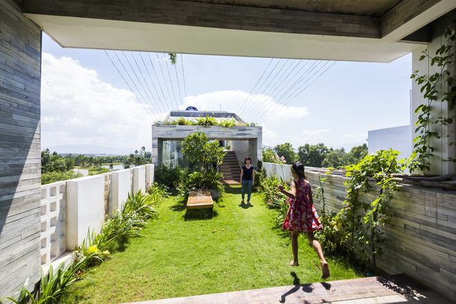 Các hoạt động của gia đình và không gian sống tập trung xung quanh và nằm bên cạnh khu trồng cây ở trung tâm và các vườn treo trong khuôn viên ngôi biệt thự.