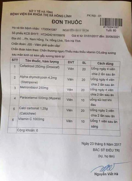 Sau đó, ông được bác sĩ kê đơn thuốc và về nhà. Khi kiểm tra tờ kê đơn, người thân của ông T. mới tá hỏa trước phần chẩn đoán của bác sĩ điều trị Nguyễn Viết Hà (Bệnh viện Đa khoa thị xã Hồng Lĩnh).