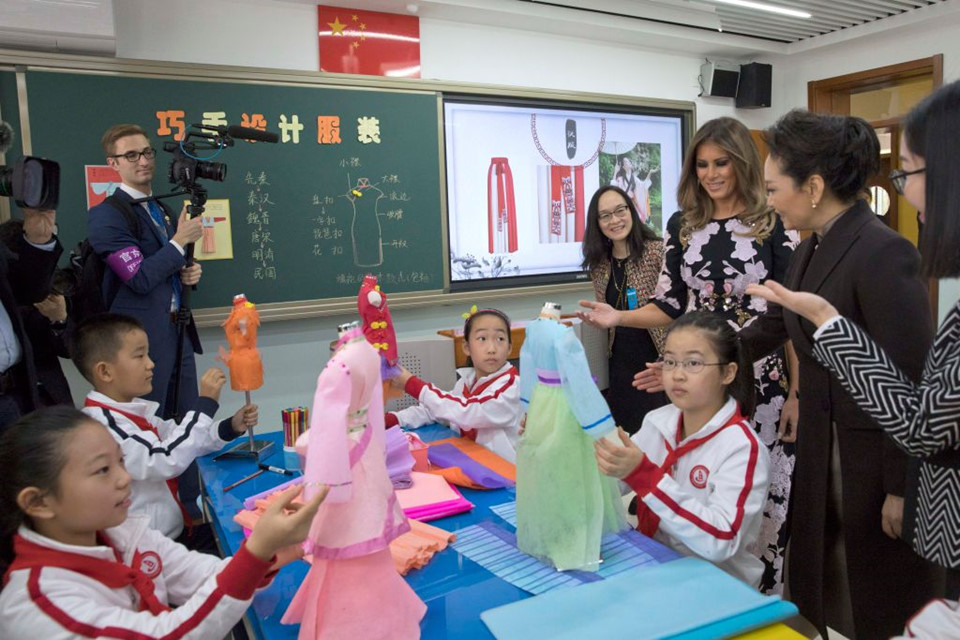 Hôm 9/11, Đệ nhất phu nhân Mỹ Melania Trump cùng Đệ nhất phu nhân Trung Quốc Bành Lệ Viện đến thăm Tiểu học Banchang, Bắc Kinh. Sự kiện này là một hoạt động nằm trong chuyến thăm của vợ chồng tổng thống Mỹ tới Trung Quốc. Ảnh: Getty.