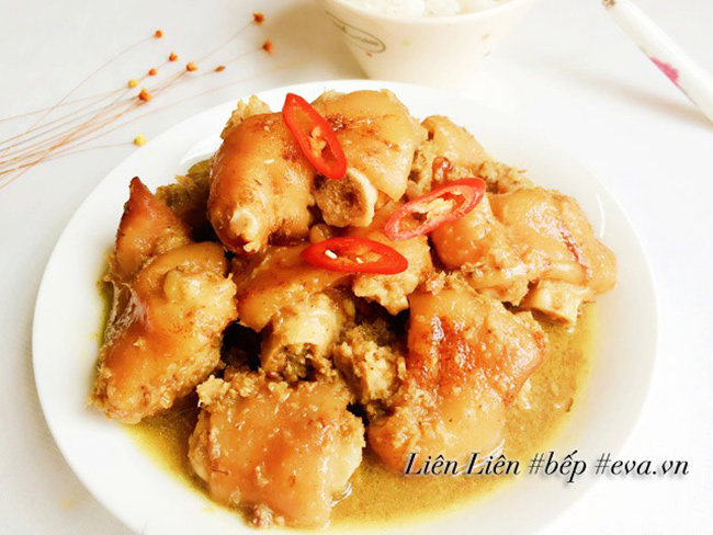 Khi nước sốt còn lại sền sệt thì tắt bếp. Cho món ăn ra đĩa thưởng thức ngay khi còn nóng. Món thịt chân giò giả cầy là món ăn rất thích hợp cho những ngày đông lạnh. Món ăn vừa đậm đà, hấp dẫn, đưa cơm ngay cả những ai khó tính.