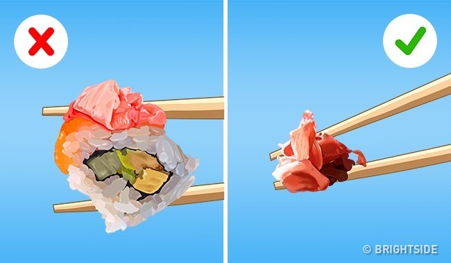 2. Nhiều người hay có thói quen kẹp gừng lên miếng sushi rồi ăn cả hai cùng lúc. Nhưng thật ra, gừng chỉ là gia vị ăn kèm sau khi đã ăn sushi.