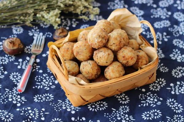 Viên xôi thành những viên tròn nhỏ khoảng 30g. Lăn từng viên xôi qua bột chiên giòn sao cho bột áo đều viên xôi.