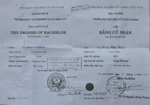 Ảnh chụp bằng đại học chuyên ngành luật được cho là "không đúng quy định" của ông Hoài lan truyền trên mạng xã hội