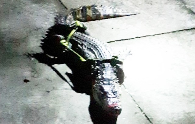 Con cá sấu bắt được trong vuông tôm. (Ảnh: CTV)