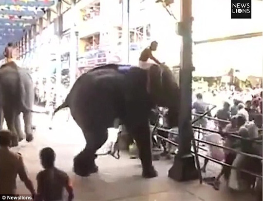 Các đoạn clip quay tại hiện trường cho thấy một con voi đang diễu hành bất ngờ húc sập rào chắn trước khi lao vào đám đông.
