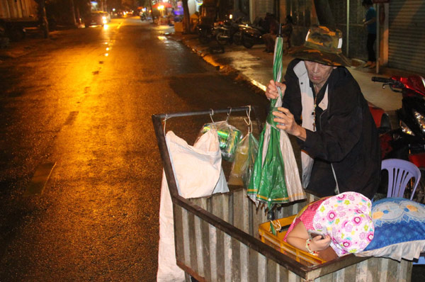 Tối 25/12, trời Sài Gòn trở lạnh do ảnh hưởng bão 16 Tembin. Từ trong con hẻm nhỏ trên đường Tân Mỹ (phường Tân Phú, quận 7, TP.HCM), một người đàn ông đứng tuổi, gương mặt rắn rỏi, đẩy một chiếc xe đẩy tay ra đường. Trên xe là một bé gái ăn, đầu đội mũ vải đang ngước nhìn cảnh vật chung quanh.