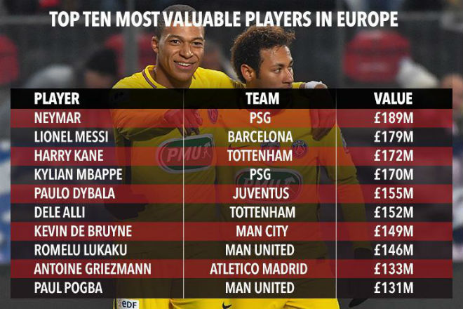 Vị trí đầu tiên thuộc về Neymar. "Tiểu Pele" được định giá gần sát với số tiền mà PSG bỏ ra hồi hè 2017 để biến anh trở thành cầu thủ đắt giá nhất lịch sử: 189 triệu bảng (so với 198 triệu bảng). Lionel Messi vẫn rất xuất sắc nhưng thua đàn em tới 10 triệu bảng vì vấn đề tuổi tác. Harry Kane, Kylian Mbappe và Paulo Dybala lần lượt đứng ở những vị trí còn lại trong top 5.