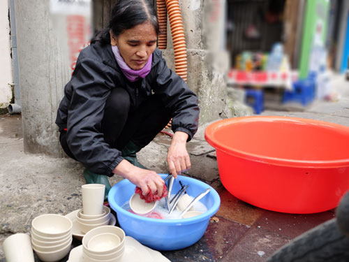 Bà Vũ Thị The, mẹ của Nguyễn Vũ Linh là lao công trong một ủy ban phường và lau dọn, rửa bát trong quán ăn. Ảnh: Quỳnh Trang.