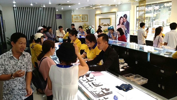 Đến khoảng 9 giờ 30, nhiều cửa hàng vàng tại TP mới đông nghẹt khách, nhiều khách hàng phải xếp hàng chờ tới lượt để mua vàng cầu may.