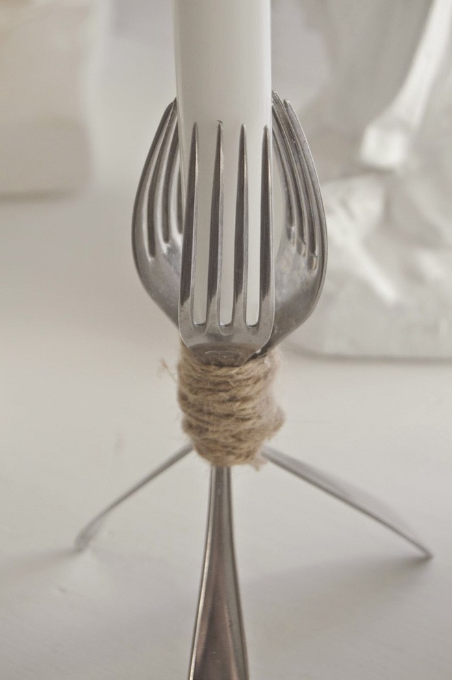 Sử dụng tay hoặc kìm của bạn để uốn cong phía trên của chiếc dĩa (phần bạn xiên các loại thức ăn) của ba chiếc dĩa. Buộc chặt phần dưới chân 3 chiếc dĩa này bằng băng cao su, ruy băng, hoặc một miếng bện. Sắp xếp để cả ba chiếc dĩa thật cân bằng trên bàn. Việc còn lại là đặt ngọn nến vào chính giữa thôi.