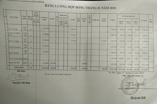 Còn ông Nguyễn Viết Bình, Kế toán của Trường THCS Ngô Mây, cho rằng giai đoạn này ông bị bệnh, phải nhập viện mổ. Khi ông về thì hiệu trưởng bảo lập bảng lương nên ông lập chứ không biết.