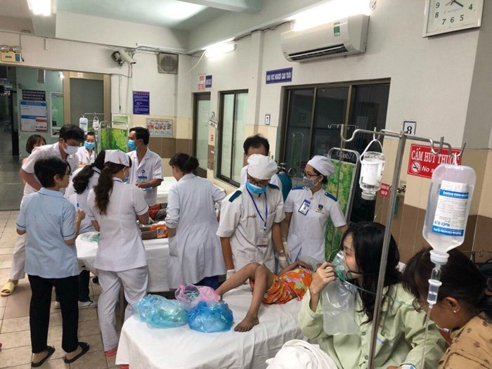 Hai cháu gái của bà Lệ (áo bông nền cam nằm trên giường) được bác sĩ chăm sóc lúc mới vào viện. Hiện hai em đă được ra viện. Ảnh: HOÀNG LAN