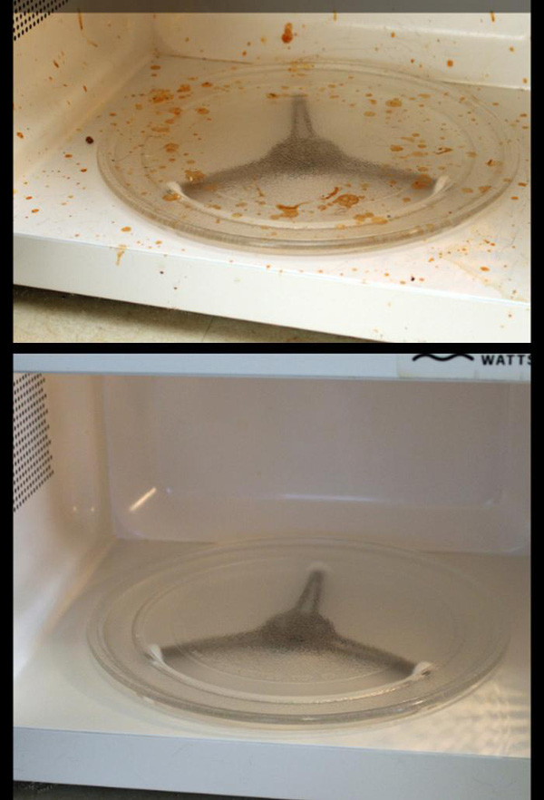 Pha 1 chén nước sạch với một muỗng canh giấm trắng trong tô, quay lò vi sóng trong 5 phút để hơi nước làm bong các vết bẩn. Sau đó, bạn dùng bọt biển hoặc khăn giấy đa năng để lau sạch bên trong lò là xong!