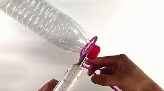 Sau đó, bạn có thể tận dựng móc quần áo sẵn có của gia đình để mắc vào đầu của chai nhựa.