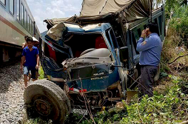 Khi đang băng qua đường sắt, chiếc ôtô tải đã bị tàu hỏa đâm hỏng nặng, 2 người trên xe cũng bị thương nặng.