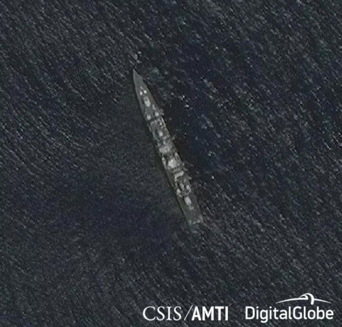 Tàu khu trục 053H1G trên Đá Chữ Thập thuộc Trường Sa hôm 4/5/2017 (Ảnh: AMTI)