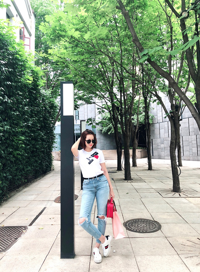Quần jeans rách dáng cổ điển được con dâu tỷ phú Hoàng Kiều phối cùng áo phông trắng họa tiết cùng giày Gucci và túi hộp Chanel cực kỳ xinh xắn