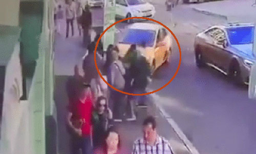Chứng kiến sự việc, một người đàn ông mặc áo cổ vũ đội tuyển Mexico chạy theo và đập vào cửa kính xe, trong khi đó một người khác mặc áo phông màu đen cố phá cửa để vào xe bắt tài xế. Tài xế lao ra ngoài chạy trốn nhưng bị đám đông đuổi theo bắt giữ.