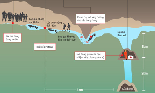 Hành trình tới nơi đội bóng nhí Thái Lan mắc kẹt trong hang. Bấm vào ảnh để xem chi tiết. Đồ họa: Tạ Lư.
