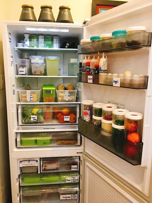 Chị chia các tầng của tủ lạnh cho mỗi thành viên trong nhà: tầng một của bố, tầng hai để đồ ăn của mẹ và tầng ba chứa sữa, trái cây của con gái. Chị tin rằng điều này giúp mỗi cá nhân có ý thức giữ gìn vệ sinh khu vực của mình.