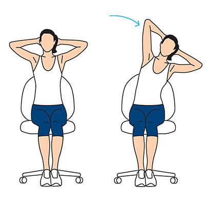 Với cách làm tan mỡ bụng động tác 3 nghiêng người này bạn nên chuẩn bị 1 chiếc ghế và ngổi thẳng người, hai tay đặt phía sau đầu. Sau đó bạn đẩy cho phần khuỷu tay ra phía sau và thở căng ngực.