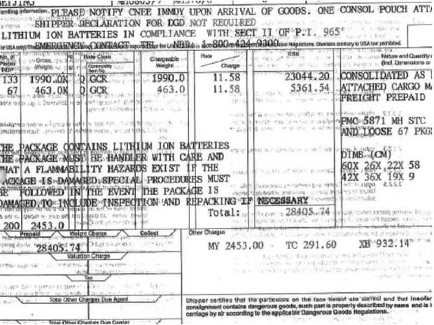 Malaysai cũng trì hoãn việc công bố thông tin về bản kê chi tiết hàng hóa cho tới 2 tháng sau khi vụ việc xảy ra. Tuy nhiên, khi tài liệu này được tiết lộ thì có thể rõ ràng nhận thấy khác biệt về trọng lượng giữa lô hàng và số pin.Trang 5 trong bản kê đề 200 pin lithium là "hàng kí gửi chung" với tổng trọng lượng lên tới 2,453 tấn. Sau này, hãng hàng không mới thừa nhận số pin chỉ là một phần nhỏ trong lô hàng và gọi phần còn lại của lô hàng là "phụ kiện radio và sạc".