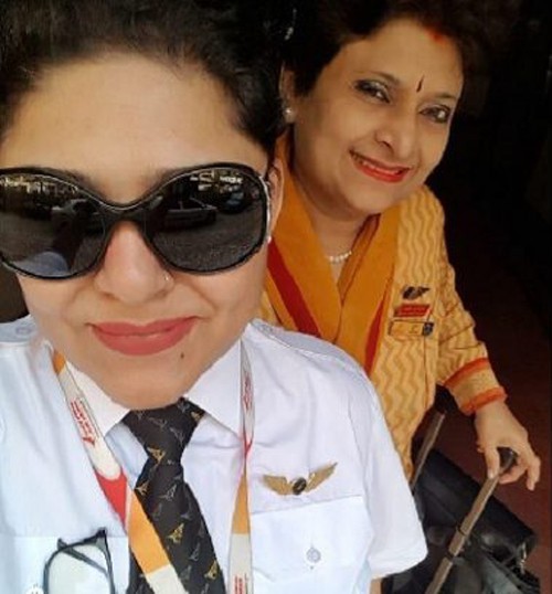 Phi công Ashrrita và mẹ, nữ tiếp viên Pooja, chụp ảnh trước khi lên chuyến bay hôm 31/7 của hãng hàng không Air India. Ảnh: Twitter.