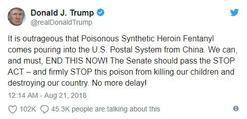 Hôm thứ Hai (20/8, giờ địa phương), tổng thống Trump chĩa mũi dùi vào Bắc Kinh bằng dòng tweet gay gắt: "Thực sự quá quắt khi chất ma túy tổng hợp Heroin Fentanyl tràn vào hệ thống bưu cục Mỹ từ Trung Quốc. Chúng ta có thể, và cần phải, chấm dứt tình trạng này ngay!"
