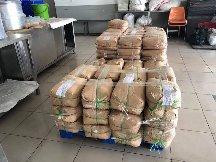 Những bịch gia vị trộn sẵn đựng trong thùng nhựa.