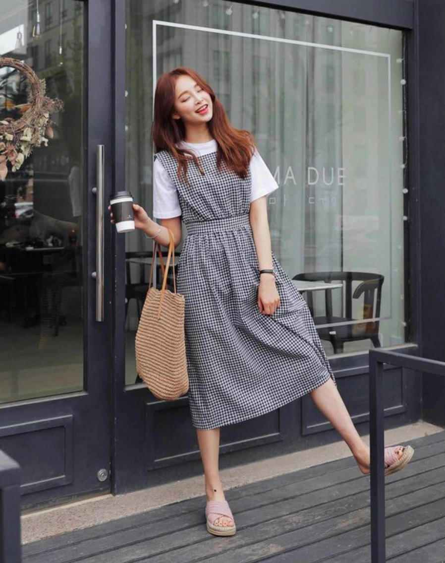 Set đồ đậm chất mùa hè với váy caro midi, túi cói và dép sandal chiến binh.