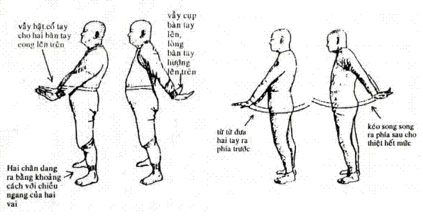 b. Hai tay duỗi thẳng theo vai, ngón tay xòe thẳng, lòng bàn tay quay về phía sau.