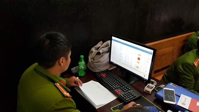 Công an TP Đà Lạt đang kiểm tra máy vi tính ở dịch vụ cầm đồ tai tiệm cầm đồ vi pham pháp luật của Hoàn Công Minh.