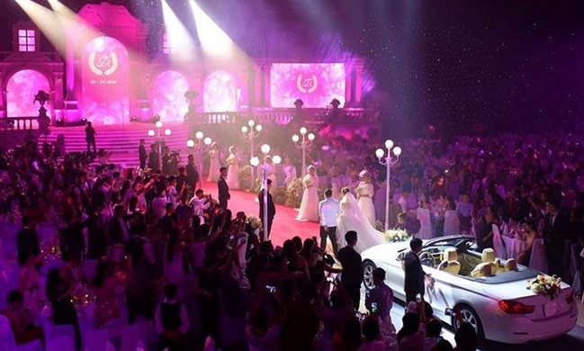 Đặc biệt, chú rể, cô dâu ngồi trên xe BMW mui trần đi vào tận sân khấu của tiệc cưới. Thực đơn các món ăn trong đám cưới đều theo tiêu chuẩn 5 sao. Bánh cưới 10 tầng, có 3 người khiêng. Thậm chí, còn có thông tin cho biết chi phí phục vụ cho “đám cưới thế kỷ” này không dưới 10 tỷ đồng.