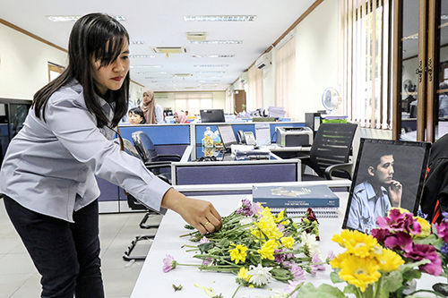 Một nhân viên của công ty khai thác thiếc quốc gia PT Timah ở Pangkal Pinang đặt hoa tại bàn làm việc của đồng nghiệp, một hành khách trên chuyến bay JT610. Ảnh: Reuters