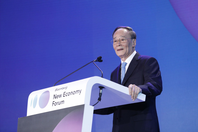 Phó Chủ tịch Trung Quốc Vương Kỳ Sơn tại Diễn đàn kinh tế mới. Ảnh: Bloomberg