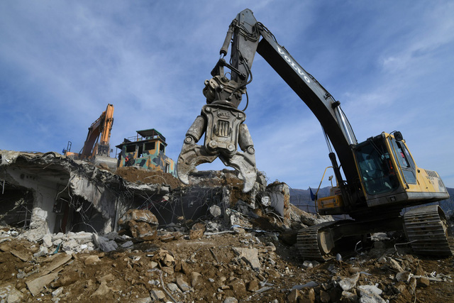 Các binh sĩ Hàn Quốc giám sát việc phá dỡ một trạm gác bằng xe ủi.