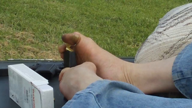 Kinh ngạc hơn nữa là người đàn ông này còn có thể dùng hai ngón chân để "gắp" từng viên đạn và nạp đạn vào hộp tiếp đạn cực kỳ khéo léo như người khác dùng tay vậy.
