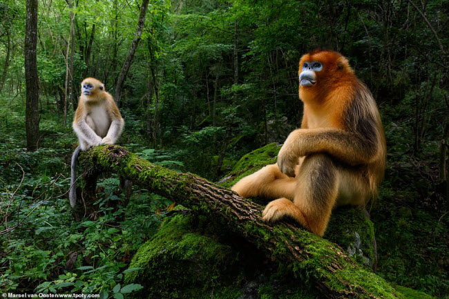 Cặp voọc mũi hếch vàng quý hiếm được nhiếp ảnh gia ghi lại trong rừng ở Trung Quốc. Ảnh: Marsel van Oosten
