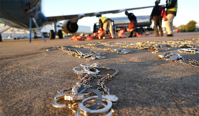 Với chân tay bị còng, dây giày bị tháo, một hàng dài những người đàn ông, phụ nữ nhập cư phải chờ trên sân bay Liên lục địa George Bush ở thành phố Houston, bang Texas, Mỹ trong khi một nhóm an ninh làm nhiệm vụ kiểm tra liệu họ có giấu bất cứ thứ gì khả nghi hay không.