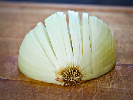 Khi thái, bạn lưu ý để lại gốc hành thái lúc cuối cùng vì các hợp chất lưu huỳnh tập trung nhiều hơn ở gần gốc.