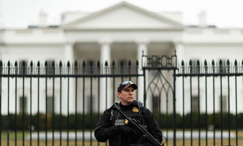 Một mật vụ Mỹ mang vũ khí canh gác bên ngoài Nhà Trắng. Ảnh: Reuters.
