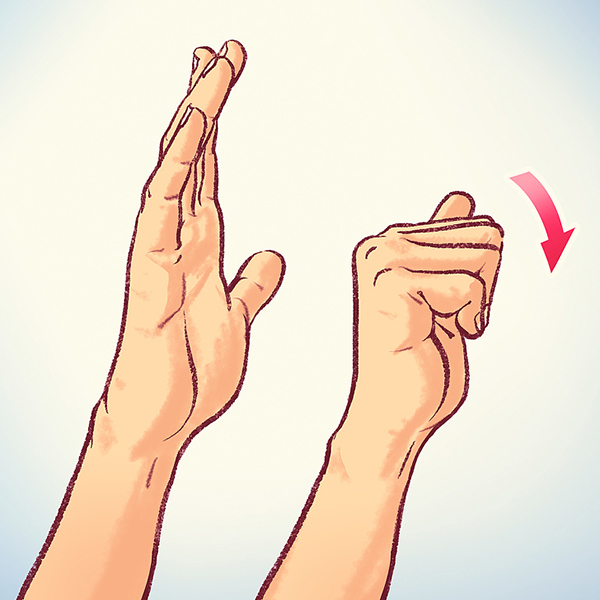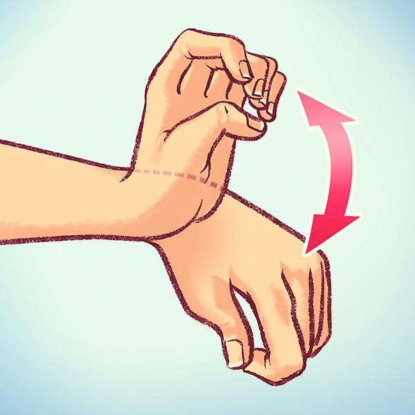 - Nắm nhẹ bàn tay, gập cổ tay về phía trước. Xoay tròn cổ tay theo hướng từ trong ra ngoài 150 lần và từ ngoài vào trong 150 lần.