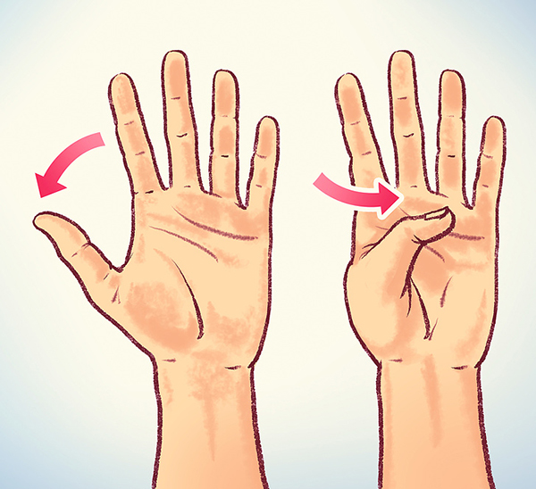 - Xoè rộng bàn tay, đưa ngón cái gập vào trong chạm vào gần ngón áp út nhất có thể. Thực hiện 150 lần mỗi ngày giúp giảm đau cổ vai gáy hiệu quả.