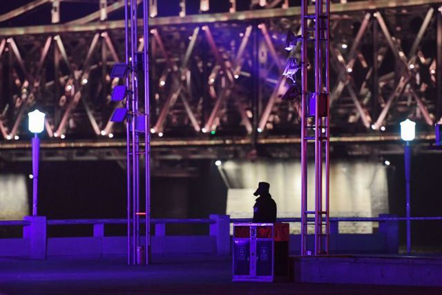 An ninh được thắt chặt trước khi đoàn tàu được cho là chở ông Kim Jong-un qua cầu Hữu nghị Trung Quốc-Triều Tiên tối 23/2. (Ảnh: AFP)