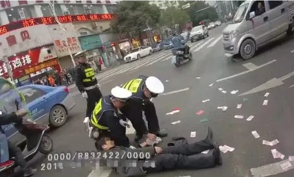Một người đàn ông đã rút dao ra tự cắt cổ tay mình và miệng không ngừng hét lên: "Chết, phải chết, tôi phải chết đi", sau khi ném tiền ra đường với các tờ tiền có mệnh giá 100 tệ nằm rải rác trên mặt đường, khiến những người đi đường xung quanh đã nhanh chóng chạy lại và gọi cảnh sát để giúp đỡ.