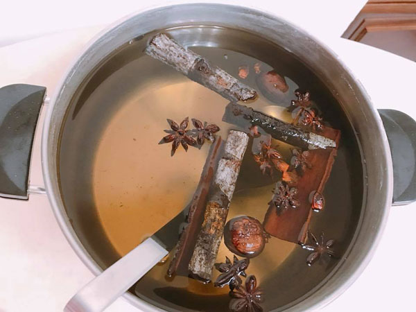 - Hồi, quế, thảo quả rửa sạch, bẻ hồi quế và đập dập thảo quả, rang thơm rồi đổ nước vào đun.