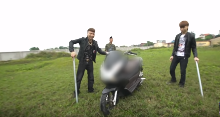Nhóm thanh niên đi cùng Khá Bảnh đã cùng nhau tẩm xăng, châm lửa đốt chiếc xe máy ngay trên một bãi đất trống. Khá Bảnh không quên gọi video cho một người bạn để khoe hành động của mình.